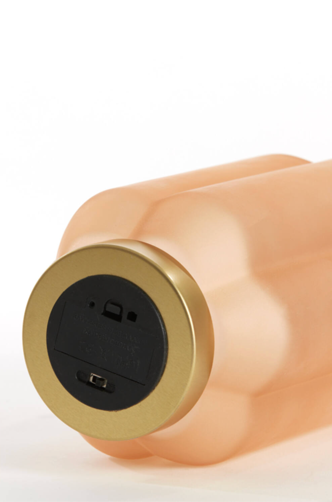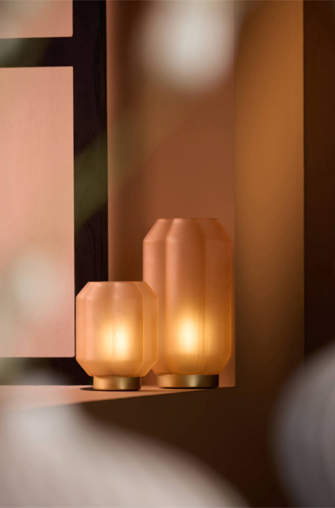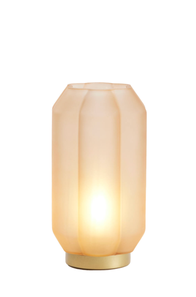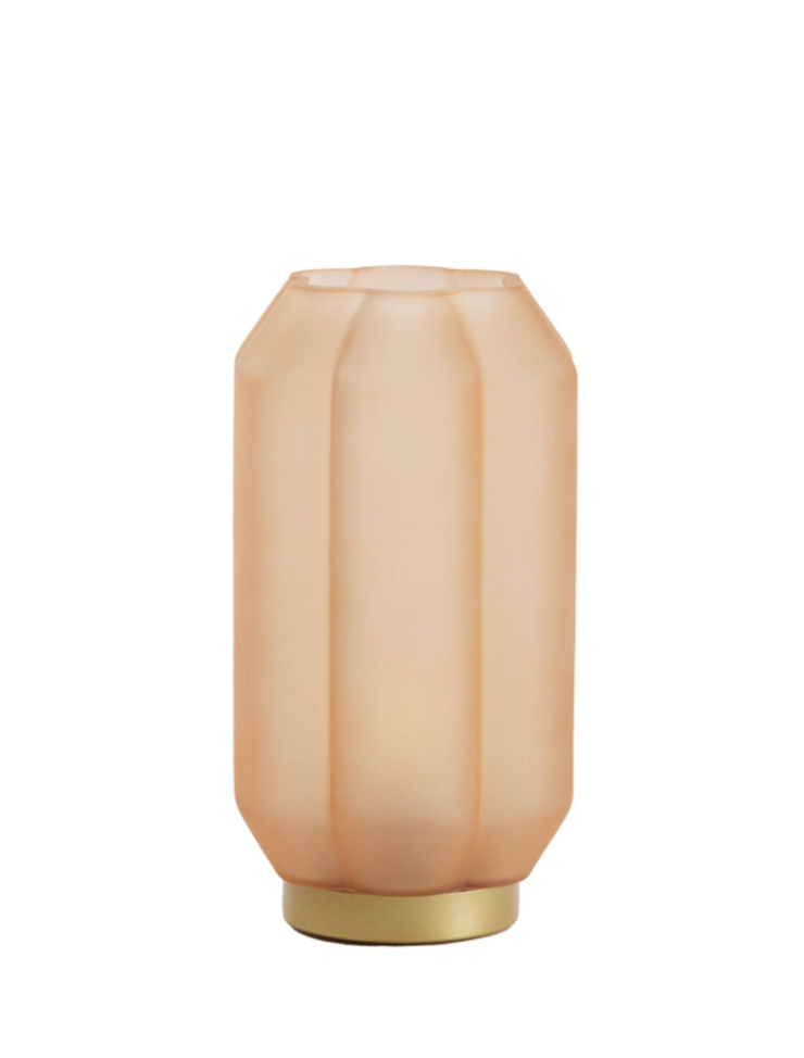 Med sin kompakta design i aprikos matt glas och guldtonade detaljer är Aurora både en snygg och praktisk ljuskälla som kan placeras var som helst – på sidobordet, i bokhyllan eller till och med på balkongen.