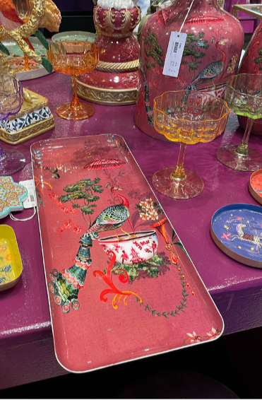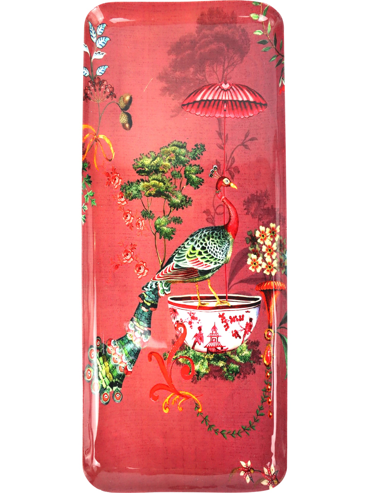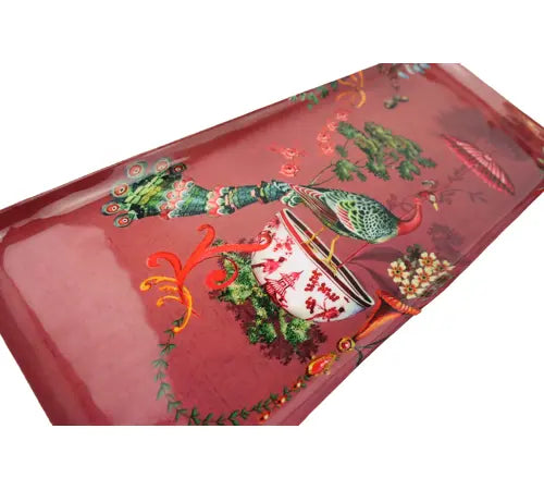 Den här brickan känns nästan som ett konstverk – fylld av färg, fantasi och förtrollning. Den djupt röda bakgrunden ramas in av magiska detaljer som bjuder in till drömmar om fjärran länder.
