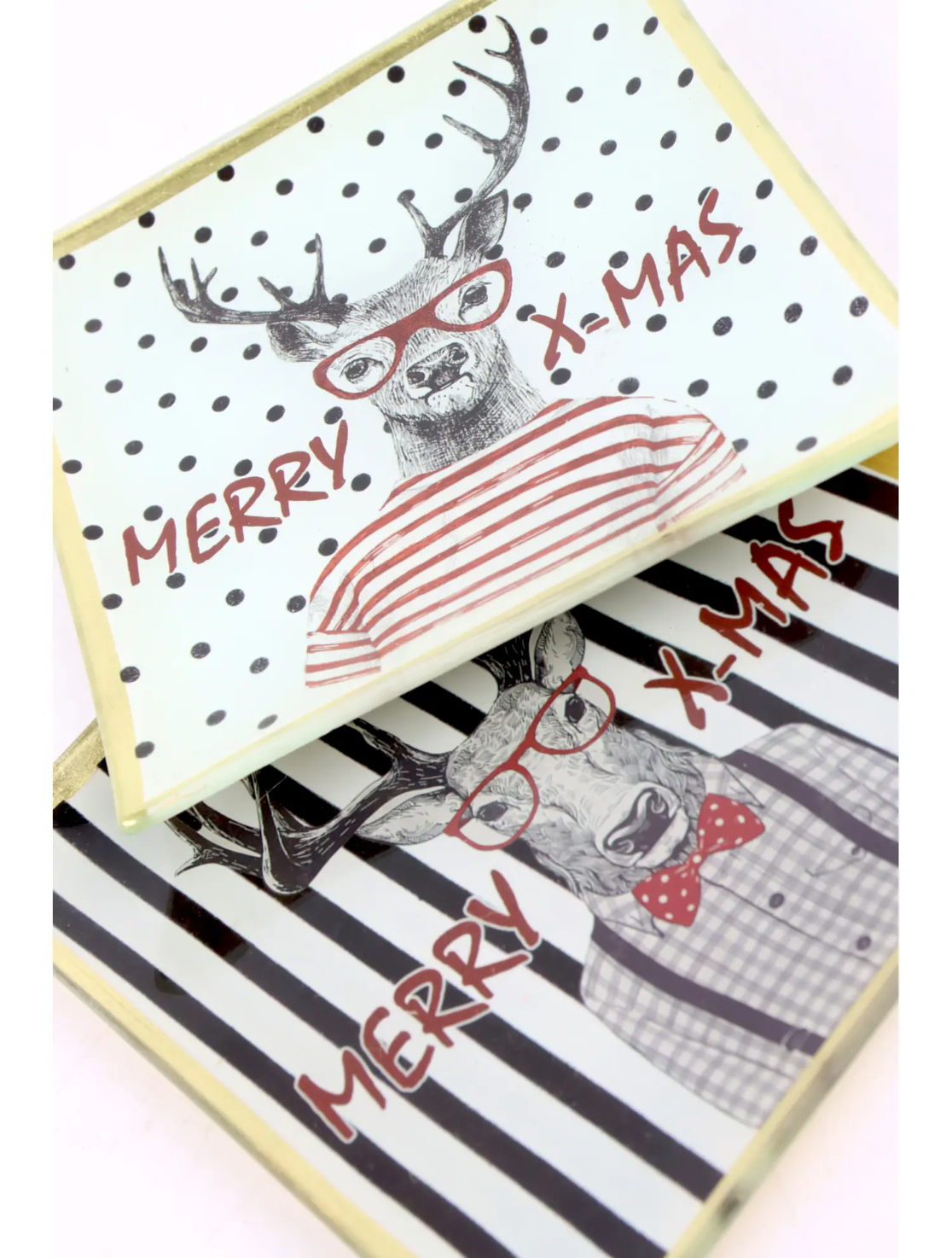De kvadratiska faten är prydda med två kompisar i glasögon, randigt och prickigt – en mix av julstämning och modern lekfullhet.