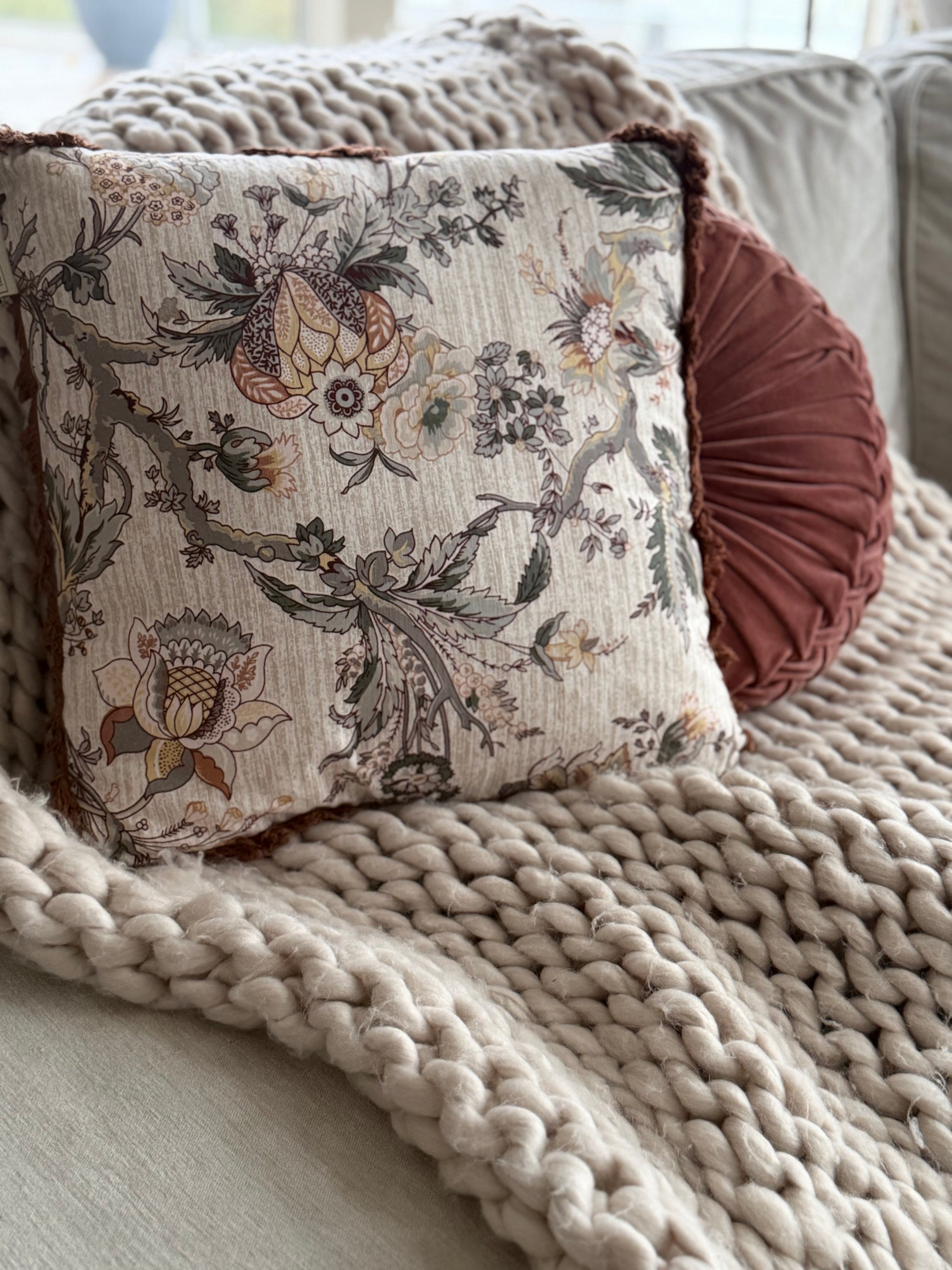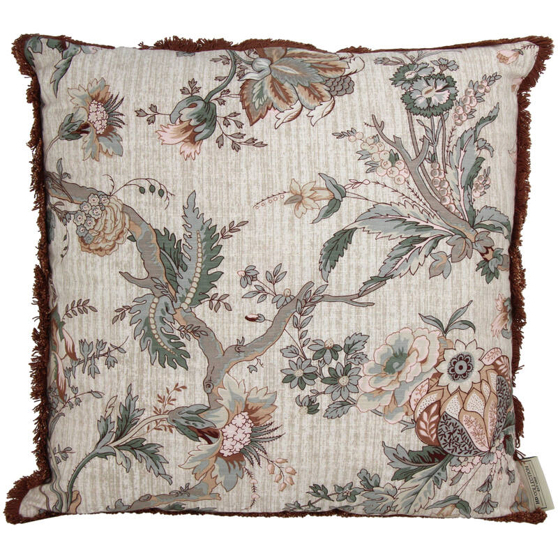DAGDRÖM är fylld med mjuka toner av grönt, beige, rött och brunt och ramas in av en vacker franskant. Mönstret andas tidlös vintage-romantik och kombineras med en harmonisk färgpalett som gör kudden lätt att matcha. En dagdröm helt enkelt.