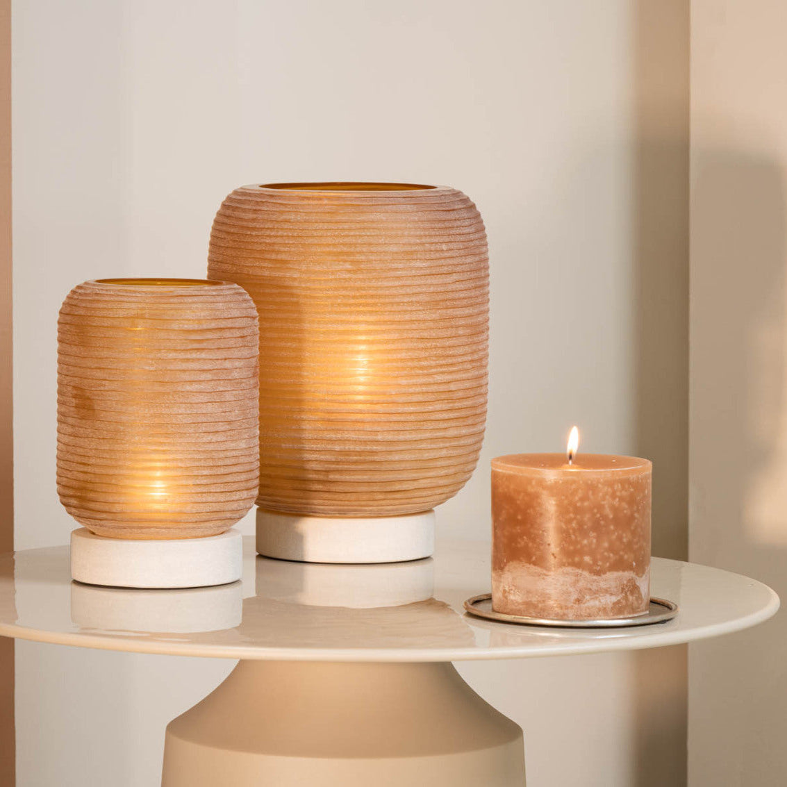 Som ett mjukt skyddande skal omfamnar COCOON GLOW ljuset och låter det sprida sig med ett varmt, dämpat sken. Det matta, räfflade glaset i bärnstensfärg vilar stadigt på en stensockel, en perfekt kombination av naturlig tyngd och mjuk elegans.