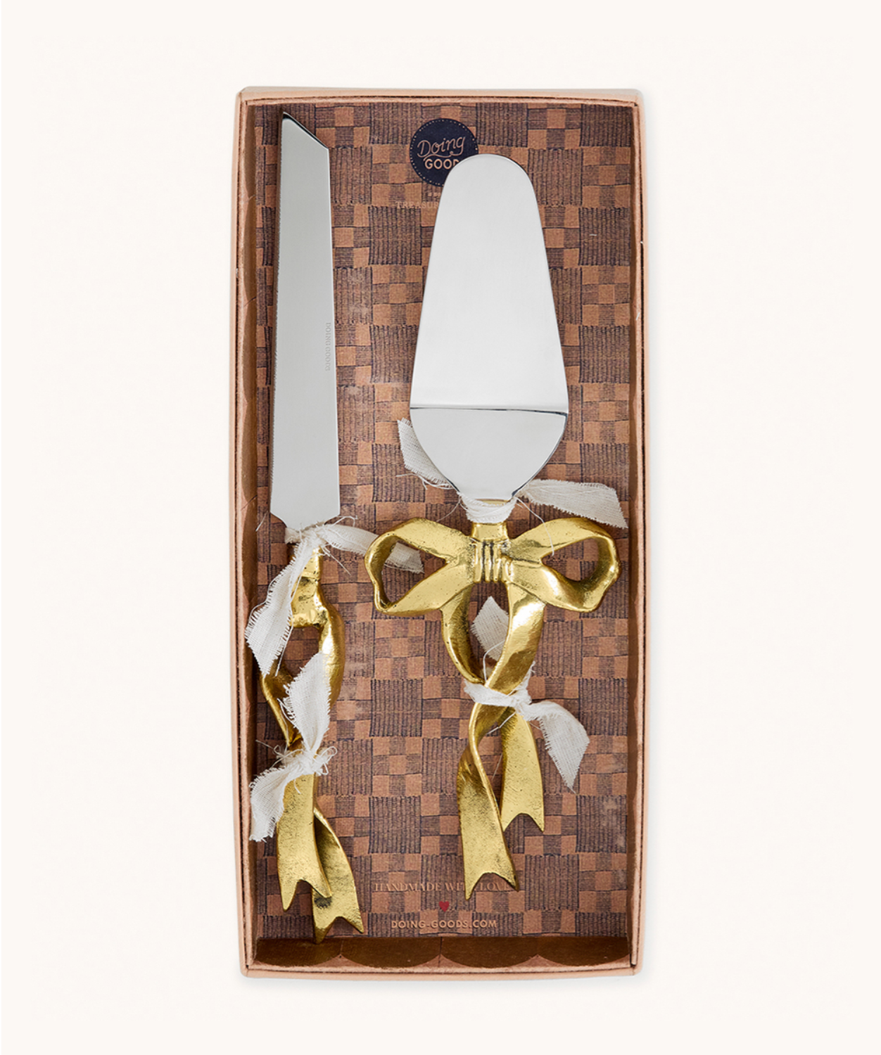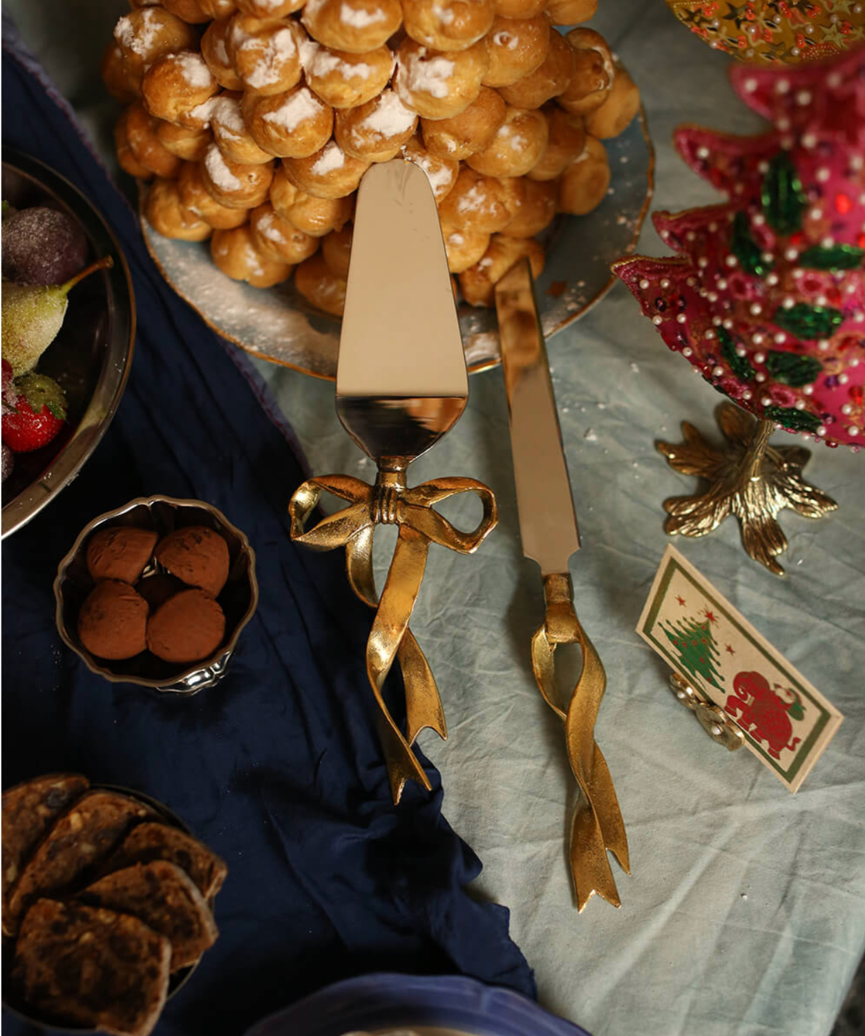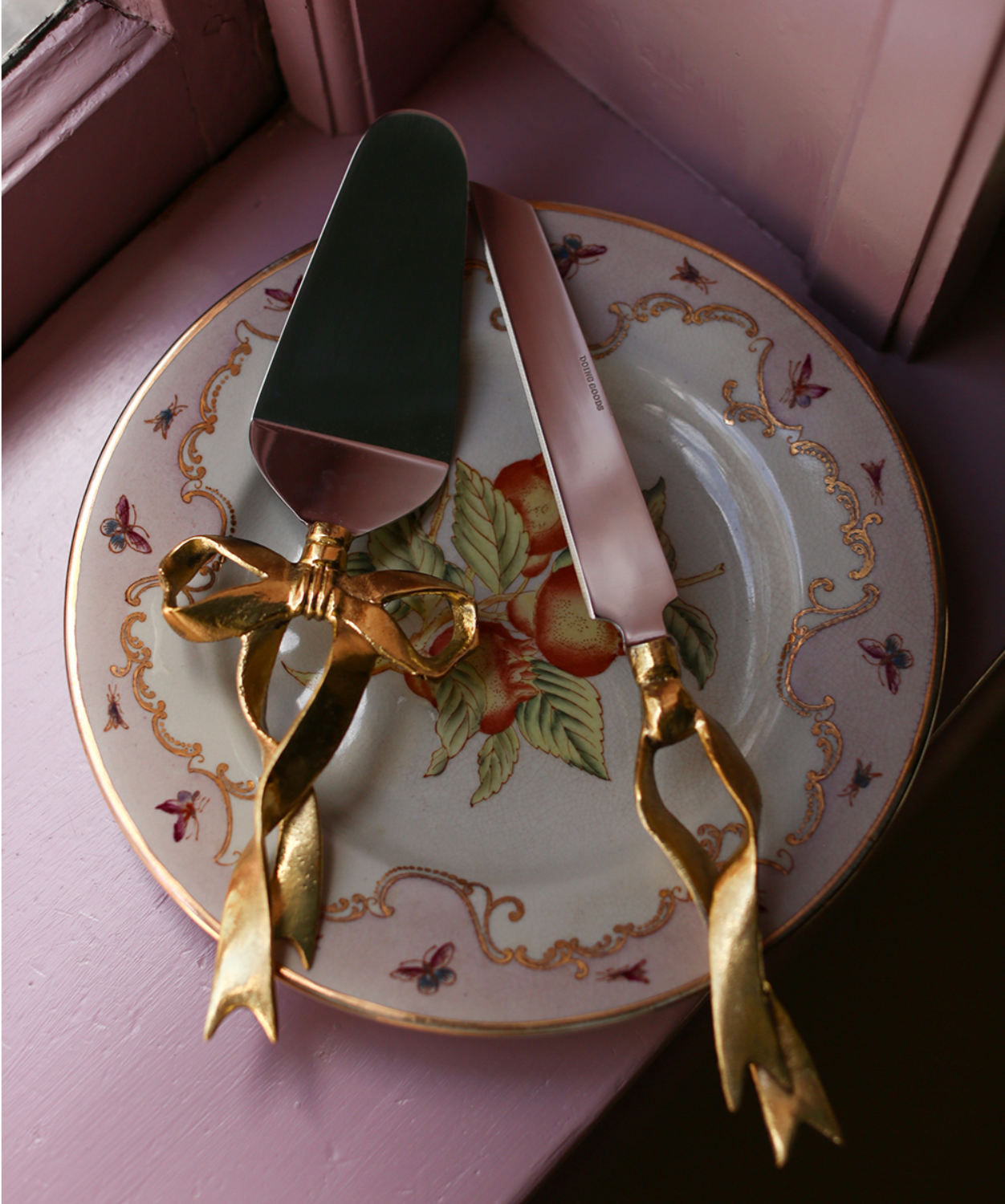 Med sina formade rosettdetaljer i guldfärgad, återvunnen mässing blir varje snitt en del av upplevelsen. Det är ett set som gärna ligger framme – även när det inte används.
